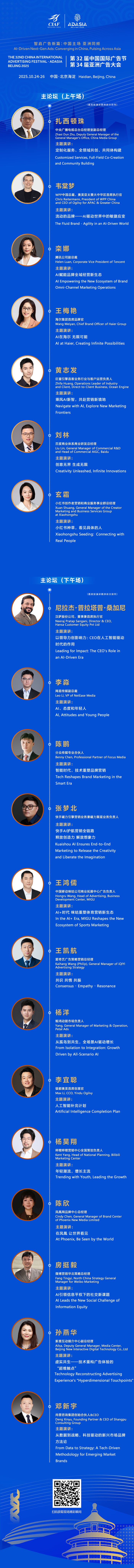 10月24日,第32届中国国际广告节&第34届亚洲广告大会主论坛将在中关村国际创新中心举行。作为“双会联动”的核心环节,论坛将汇聚广告营销行业精英、学界及业界代表,为行业创新发展赋能。本届主论坛精准紧扣“智启广告新篇:中国主场,亚洲同频”的核心活动主题,以 “科技赋能?智启未来” 为核心目标,聚焦广告行业的创新变革路径与国际合作新机遇。围绕“AI 驱动品牌变革”这一核心议题,中央广播电视总台、WPP、腾讯、海尔、抖音集团旗下巨量引擎、百度、小红书等国内外行业龙头企业的高管将悉数登台亮相,结合丰富的实战案例,深度解析 AI 赋能营销升级、品牌国际化突围策略、内容营销创新趋势等行业焦点问题,全方位、多角度展现中国广告业在科技驱动下的卓越发展成果与前沿探索方向。与此同时,针对广告行业多领域的热门应用场景,汉萨股份、网易传媒、分众传媒、快手磁力引擎、中国移动咪咕、爱奇艺、鲸鸿动能、银都奥美、哔哩哔哩、凤凰网、微博、新意互动、尚普咨询等知名企业代表,将结合自身经验,围绕垂直领域前沿与前瞻性内容,分享实战干货。作为兼具权威性、前瞻性与国际性的行业盛会,本次主论坛是中国广告业对接国际、展现行业力量的重要契机。10月24日,共见行业创新,同绘发展蓝图。更多资讯,敬请关注中国国际广告节(https://www.chinaciaf.org/index.jhtml)及中国广告协会(http://www.china-caa.org/)的官方网站及微信公众号;扫描下方二维码可一键免费注册参会,获取日程更新、嘉宾动态等最新信息,我们在北京海淀等你!