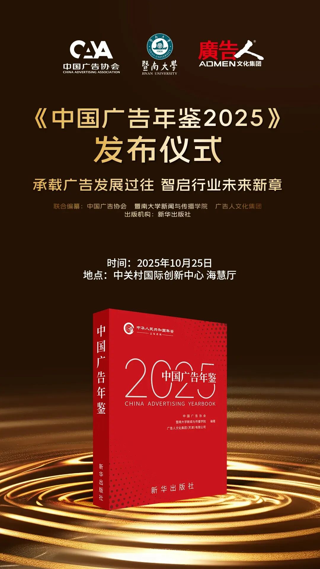 由中国广告协会、暨南大学新闻与传播学院、广告人文化集团联合编纂的《中国广告年鉴(2025)》即将正式出版。10月25日,在第32届中国国际广告节暨第34届亚洲广告节“金伙伴发布仪式”环节,中广协等三家合作单位联合对外宣布,《中国广告年鉴(2025)》将由新华出版社正式出版,本辑年鉴是中广协《中国广告年鉴》系列总第29期。