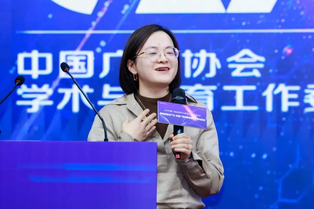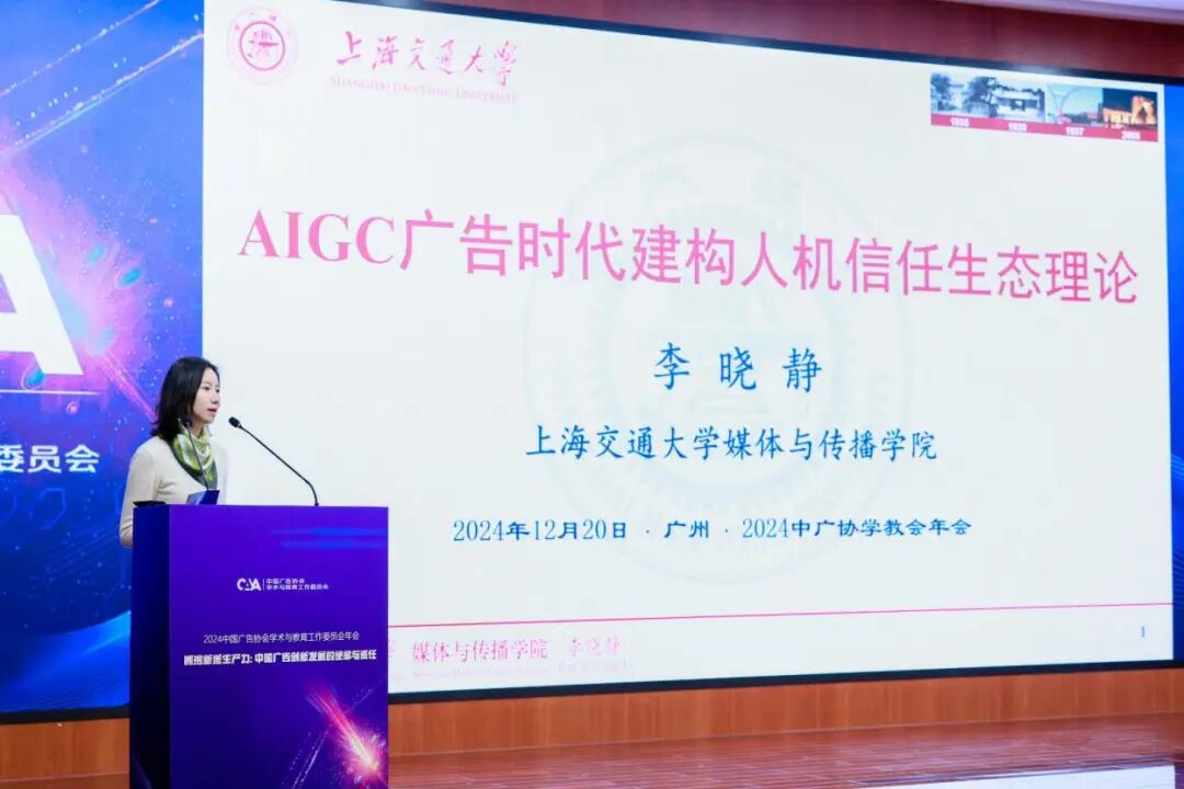 上海交通大学新闻与传播学院长聘教授、青年长江学者李晓静是中国国际广告节长城奖(学术类)银奖的获得者,她发表了《AIGC广告时代构建人机信任生态理论》演讲。