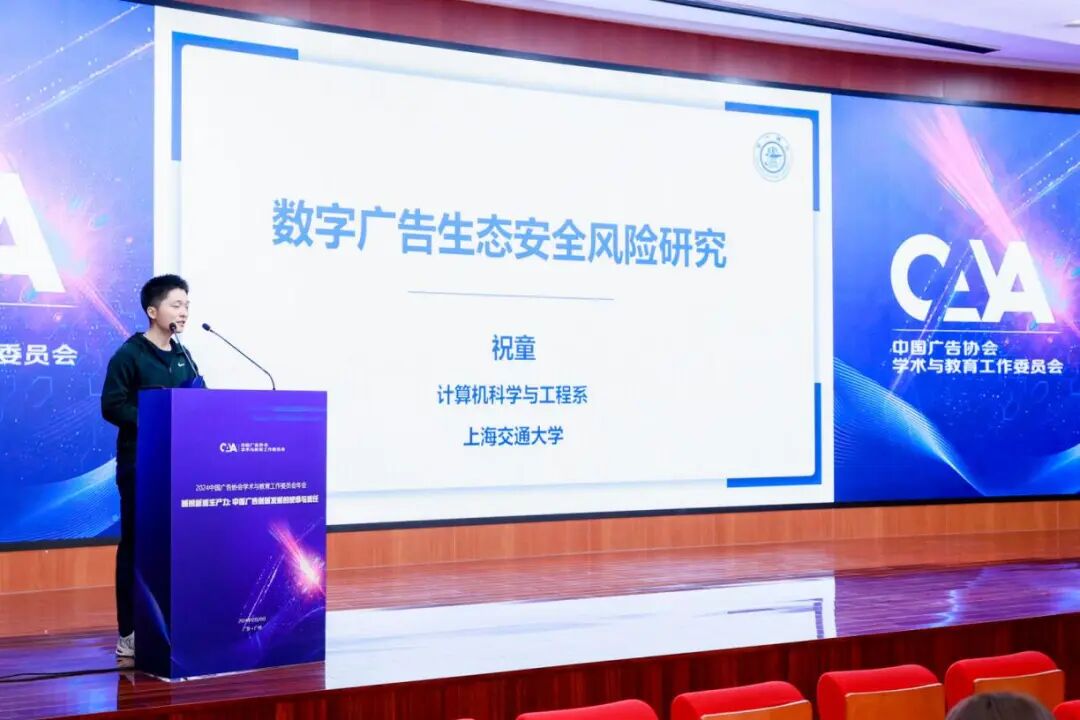 上海交通大学计算机科学与工程系博士生祝童是中国国际广告节长城奖(学术类)金奖获奖团队的代表,发表了《数字广告生态安全风险研究》演讲。