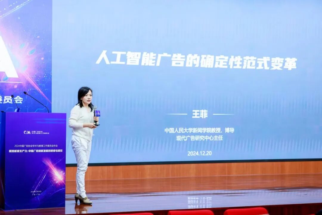 中国人民大学新闻学院教授王菲发表了《人工智能广告的确定性范式变革》演讲。