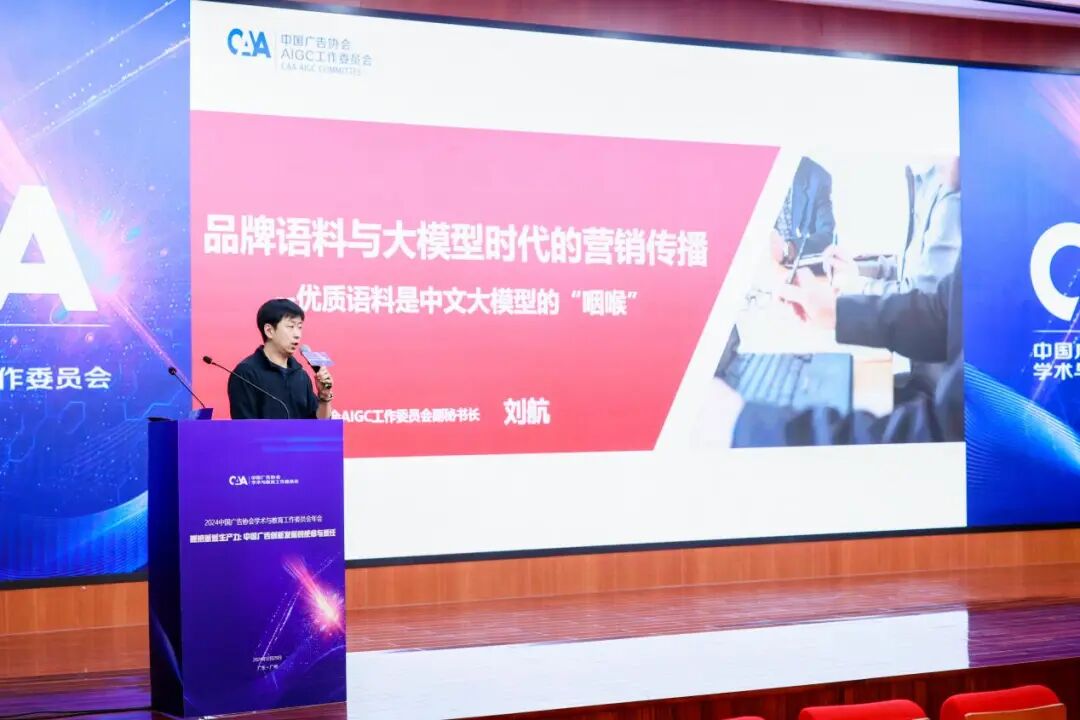 中国广告协会AIGC工作委员会副秘书长刘航发表了《品牌语料与大模型时代的营销传播》演讲。